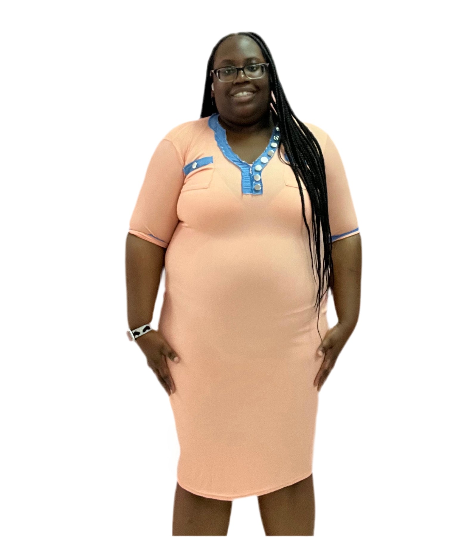 • This denim trim midi dress is a must-have for any wardrobe.